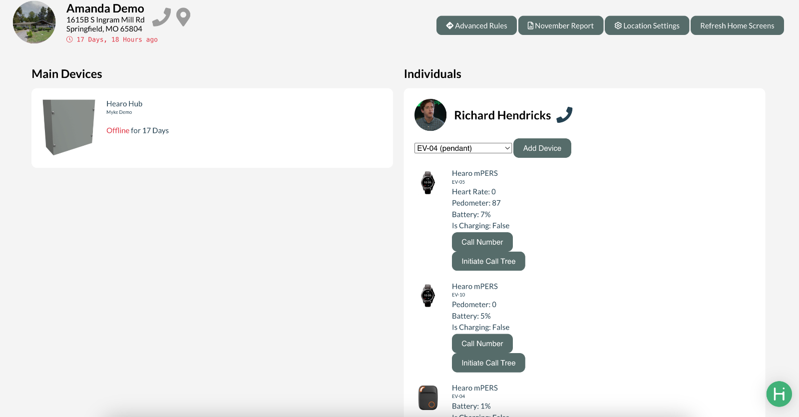 If there are any pendants or watches being worn by Individuals at the Location they will be visible here, as well as any listed device/cell phone that is running the Hearo Mobil application. This information is located directly under the Individuals heading on the right-hand side of the page.